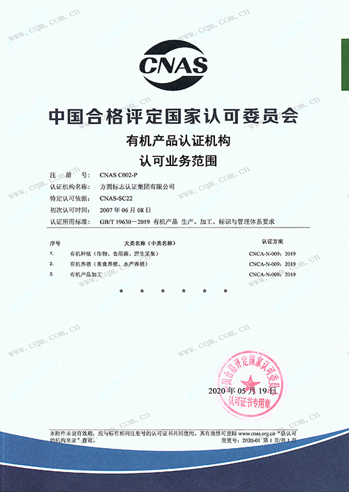 有机产品认可证书
