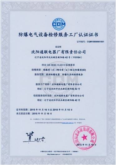 近日,方圆集团向“沈阳通联电器厂有限责任公司”颁发了国内首张防爆电气设备检修服务工厂认证证书。这是方圆集团推动国内防爆电气设备认证业务发展的又一个里程碑。