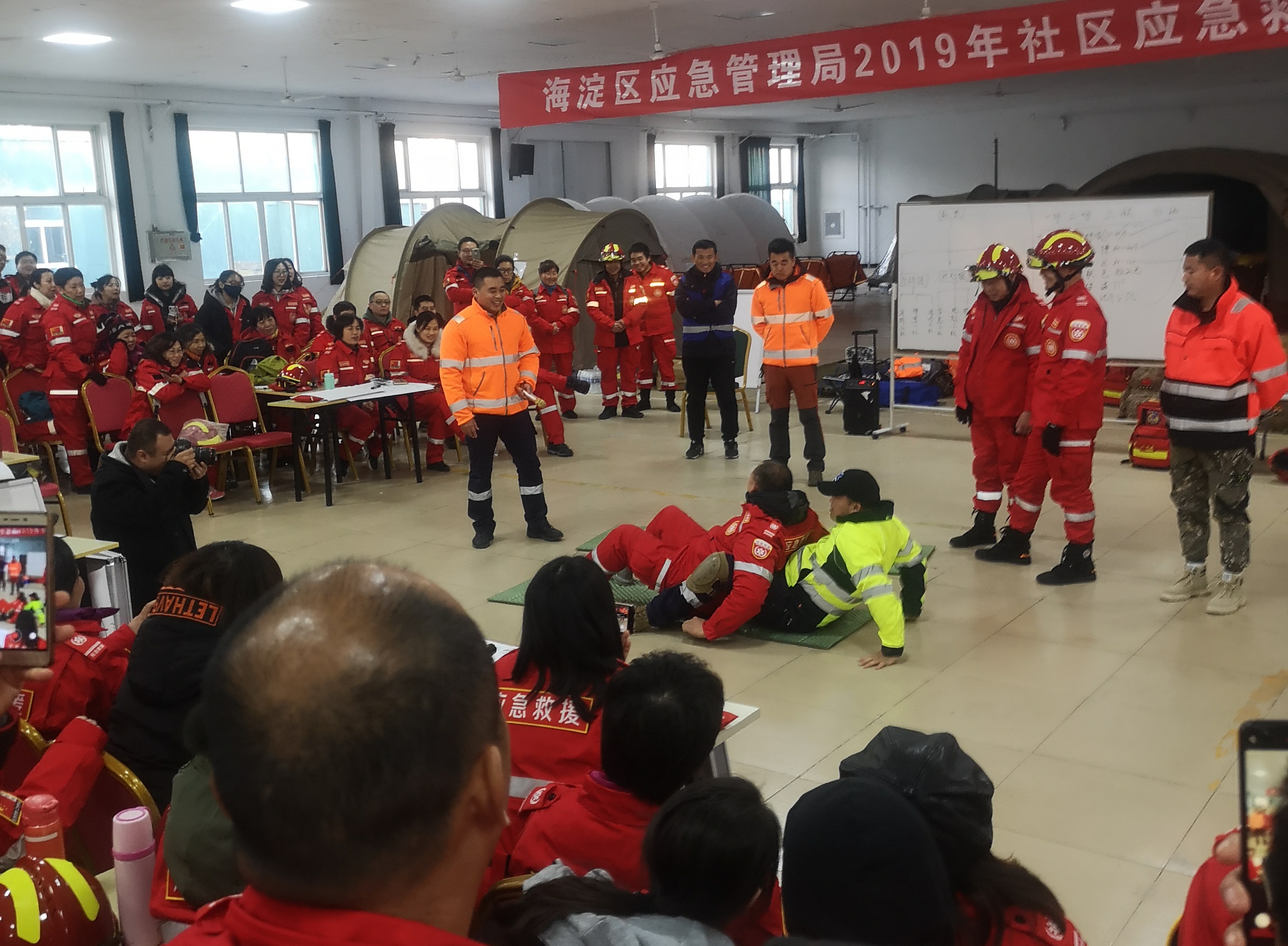 在“创建综合减灾示范社区应急救援员培训”期间,方圆集团公司特聘请应急管理局专家作为理论课程主讲师、蓝天救援队教官作为实操项目主教官,参照国家一般紧急救援员训练课程标准,对550余名社区工作人员进行了医疗急救、搜索救援、地震救援、火灾应急处置、疏散演练等科目的训练,其中涉及心肺复苏、止血包扎、院前急救、灾害现场处置、救援队组建等实用性极强的训练课程。蓝天救援队主教官结合多年亲身经验,深入浅出地讲解了社区层面可能面对的救援状况,列举了丰富的实际案例,并组织学员现场演练。