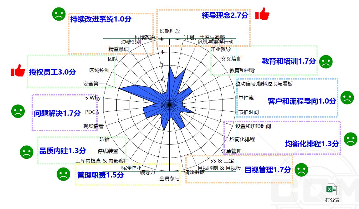 经过培训顾问多维度的数据收集与现场问询,对该工厂的精益成熟度打分为1.7分,企业存在较大的改善空间。
