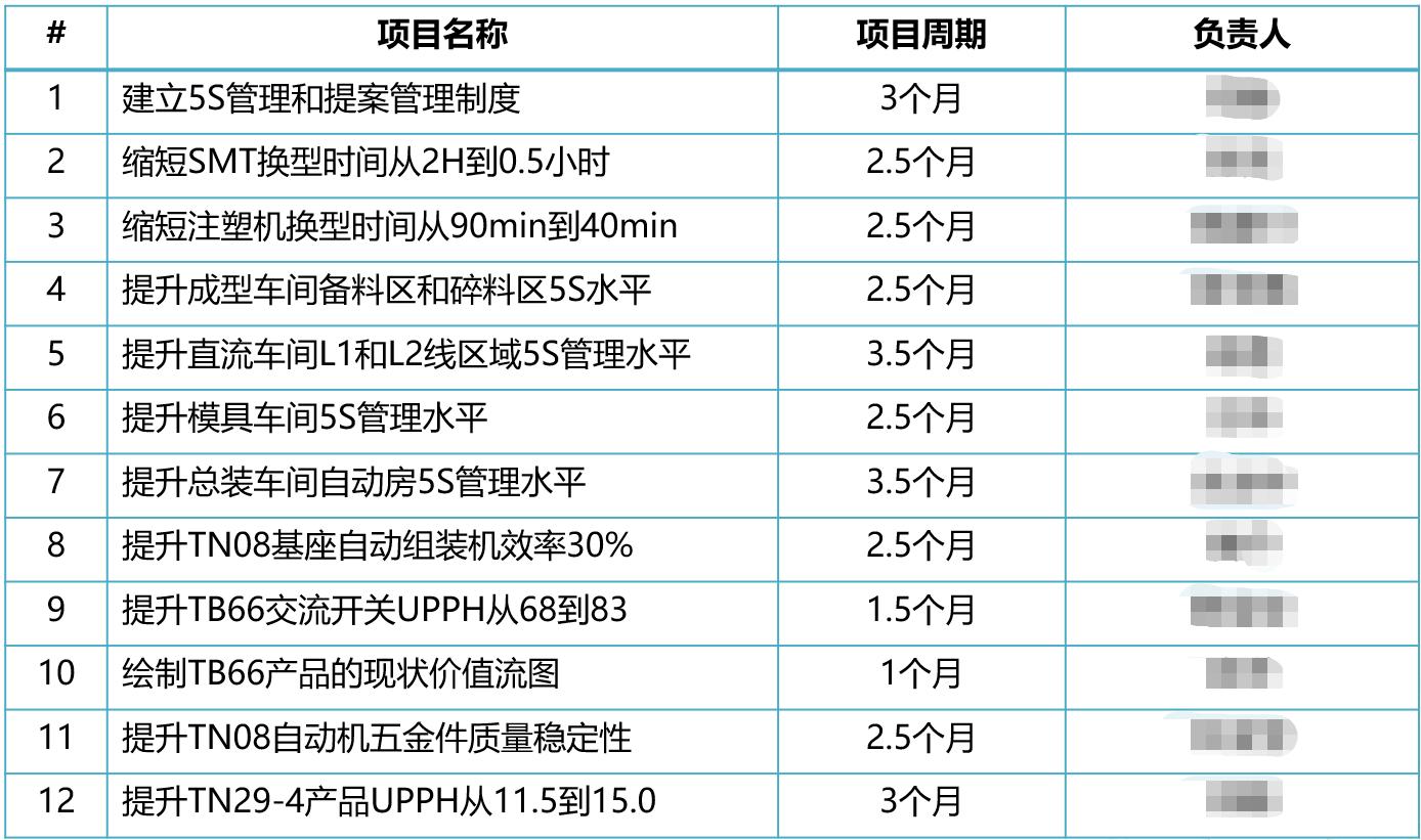 培训顾问以精益培训结果落地为目的,首先辅导企业设立内部自主改善课题。经过与企业的沟通交流,决定对12个改善课题进行立项。改善课题的进行,不仅可以使受训学员将知识方法与实际工作相结合,也可以帮助企业建立精益改善长效机制。