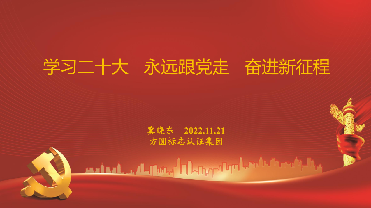 冀晓东书记强调,奋力开创新时代方圆标志认证集团工作新局面,要求充分认识党的二十大的重大意义,切实增强奋进新时代新征程的坚强决心;深刻领会党的二十大的精神实质,准确把握关系党和国家事业发展的重大理论和实践问题;全面贯彻党的二十大的实践要求,不断推动方圆标志认证集团事业高质量发展。