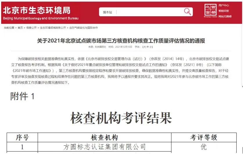 在北京市碳核查机构考评中方圆标志认证集团连续3年获评“优”级且综合排序第一名