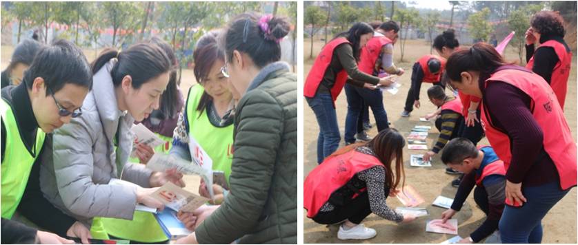 “搭桥过河”游戏中,两队激烈的比拼,团结一致,相互帮扶,确保每一位队员顺利通过,到达彼岸