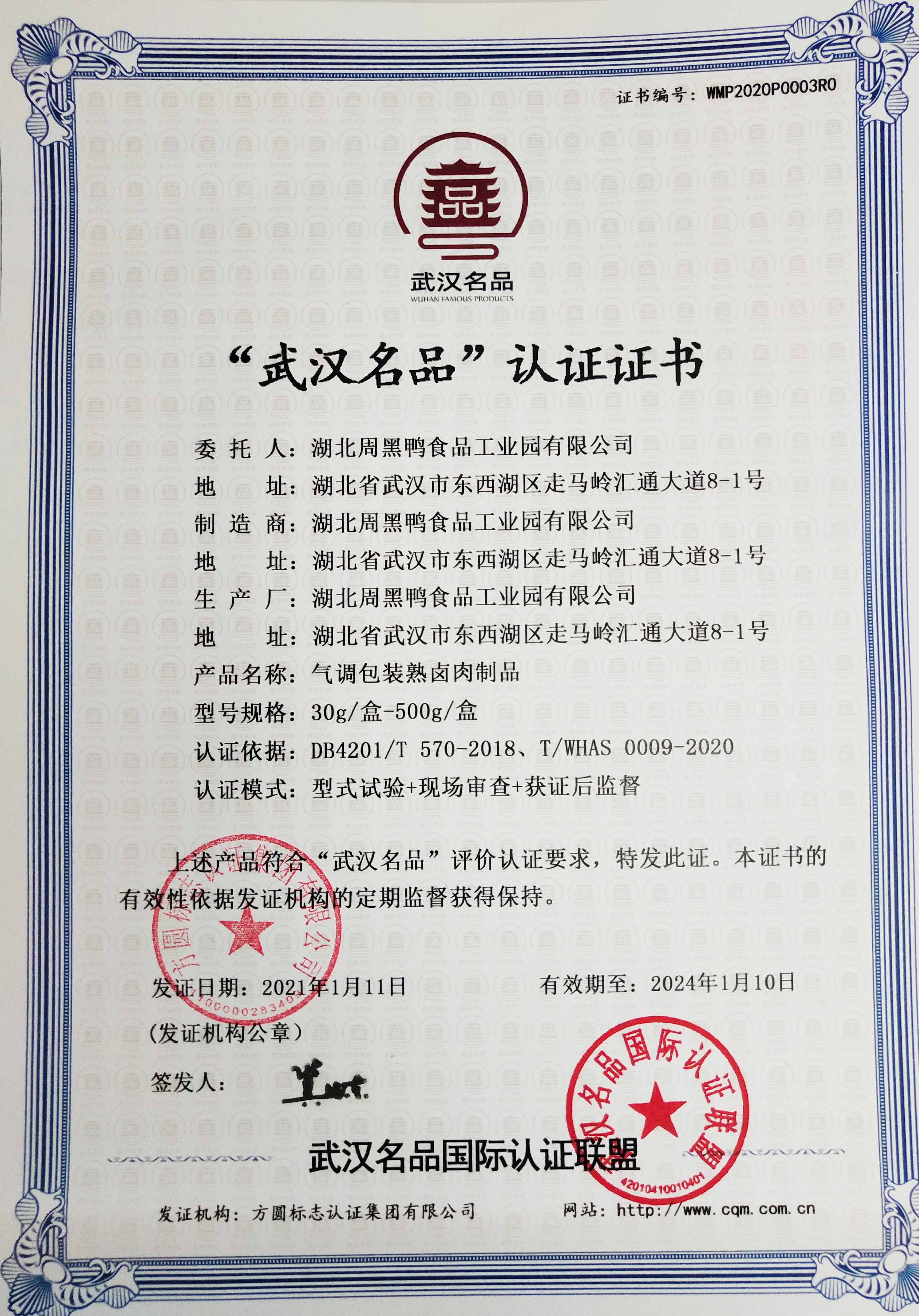 1月11日,方圆标志认证集团为湖北周黑鸭食品工业园有限公司颁发了由方圆湖北公司主导参与的方圆集团第一张“武汉名品”认证证书。由此,拉开了我们服务于“武汉名品”工作的序幕,为推动武汉的质量和品牌发展贡献我们的力量。