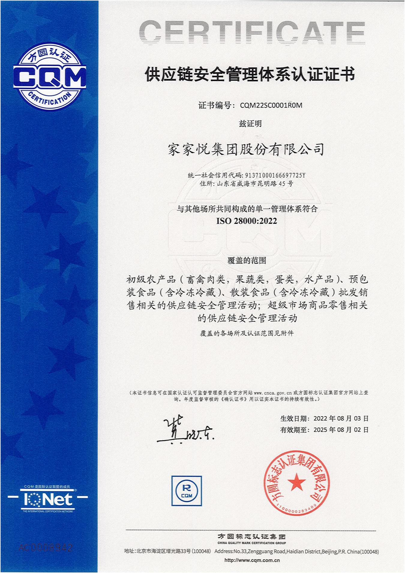 家家悦集团股份有限公司是以超市连锁为主业,上交所主板上市,以区域一体化物流为支撑,以发展现代农业生产基地和食品加工产业链为保障,以经营生鲜为特色的全供应链、多业态的综合性零售渠道商。为方圆标志认证集团的优质客户,已通过了质量、环境、职业健康安全、食品安全、HACCP等认证。此次供应链安全认证是应运输和物流行业对共同安全管理标准的需求而发展并提出的,其最终目标是改进供应链的全面安全,体现了家家悦集团对社会责任和客户承诺的高度重视,能够增进顾客及相关方满意度,适应市场需求的意识。